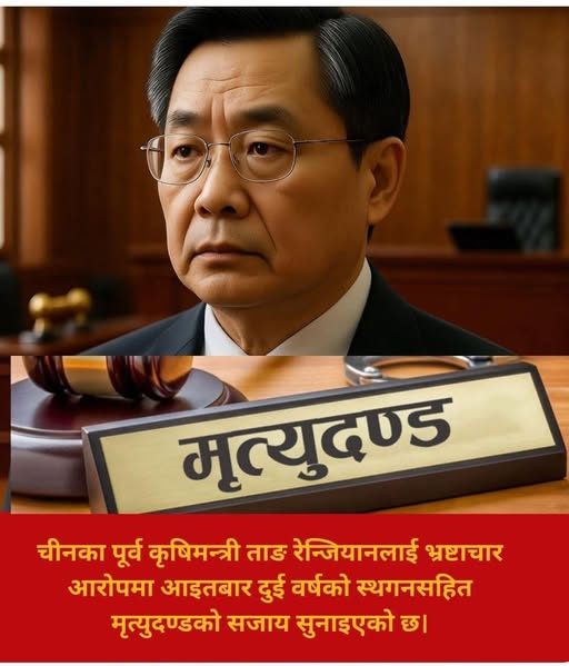 एजेन्सी ,१३असोज, । चीनमा विगत केही वर्षदेखि निरन्तर चलिरहेको भ्रष्टाचार विरोधी अभियान अन्तर्गत पूर्व कृषिमन्त्री ताङ रेन्जियानलाई मृत्युदण्डको फैसला सुनाइएको छ ।