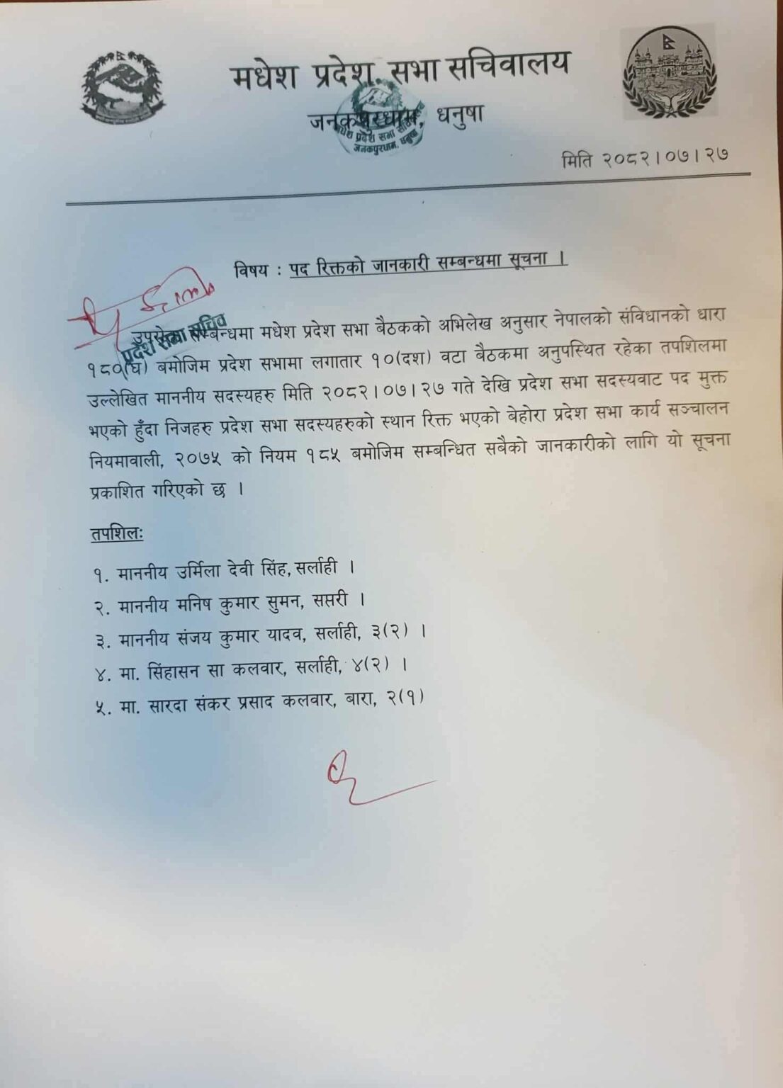 जनकपुरधाम,२७ कार्तिक । लगातार दस बैठकमा अनुपस्थित रहेकाले मधेश प्रदेशसभाका पाँच जना सांसद पदमुक्त भएका छन्। संविधानको धारा १८० को उपधारा (घ) अनुसार उनीहरूको सदस्यता स्वतः समाप्त भएको प्रदेशसभा सचिवालयले जनाएको छ ।